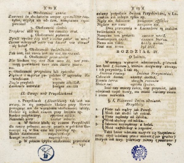 Jako że nauka gramatyki polskiej ma pomóc w nauce gramatyki łacińskiej, obok paragrafów traktujących o imionach polskich uwzględnione są wybrane imiona łacińskie (ich typy i odmiany).