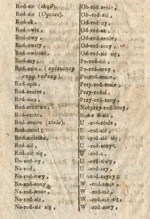 Rozdział dotyczący słowotwórstwa składa się z dwóch paragrafów, w których przeprowadza Kopczyński niejako analizę słowotwórczą przykładów łacińskich i polskich. Punktem wyjścia tej analizy jest źrzódłosłów, który de facto ujawnia niedoskonałość etymologicznego warsztatu autora – wywodzi on bowiem (na podstawie podobieństwa graficznego i fonetycznego) rzeczowniki ród, gród i chód od przyimka od. Kolejnym krokiem tej osiemnastowiecznej analizy słowotwórczej jest wskazanie rodziny wyrazów, które zostały utworzone od rzeczownika ród. Wyrazy te nazywa wyrazami pochodnymi. Zaprezentowano je na poniższych ilustracjach★.